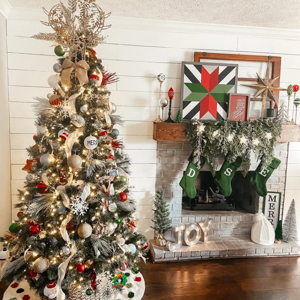 A classic Christmas color scheme featuring green stockings with family initials hanging from a brick fireplace. The wooden mantel displays barn quilt art and festive signage, while natural greenery with lights creates warmth. This design embraces timeless holiday traditions with personalized family touches.