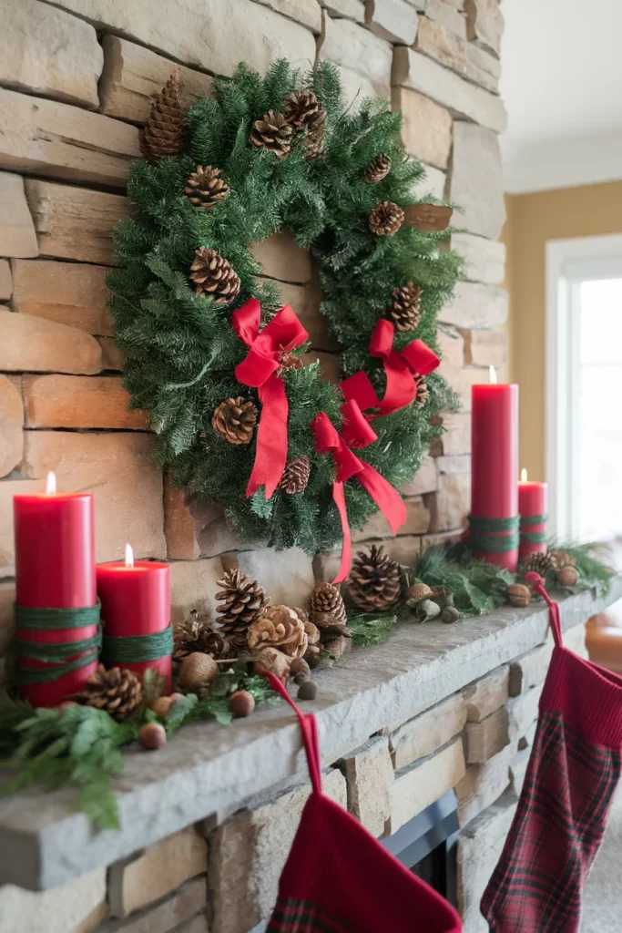 This mantel showcases a full evergreen wreath adorned with natural pinecones and bright red ribbon bows. Matching red candles with green ribbon accents line the mantel, while additional pinecones, nuts, and red plaid stockings complete the classic Christmas color scheme against the stone fireplace.