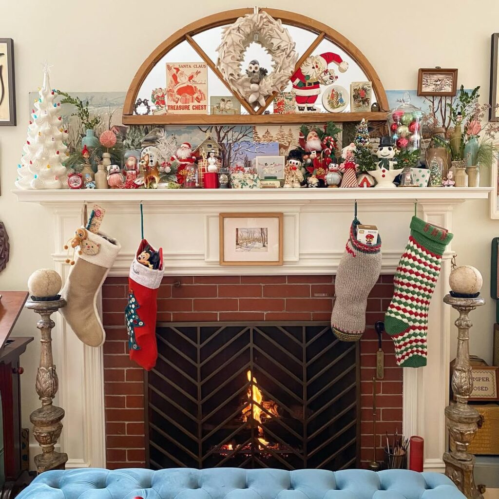 A collector’s dream mantel featuring an extensive display of vintage Christmas figurines, Santa decorations, and nostalgic holiday items. The arrangement creates a charming Christmas village effect with various heights and textures. Mixed stockings hang below while the collection tells a story of Christmas traditions spanning different eras.