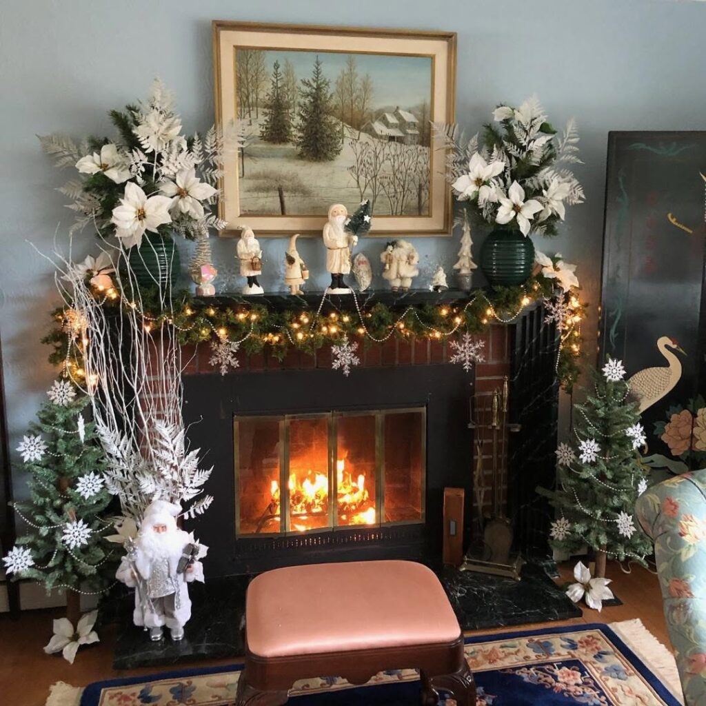 This mantel combines white poinsettias with natural greenery and features vintage Santa figurines on the mantel shelf. String lights woven through the garland create warmth, while a winter landscape painting above the fireplace enhances the nostalgic atmosphere.