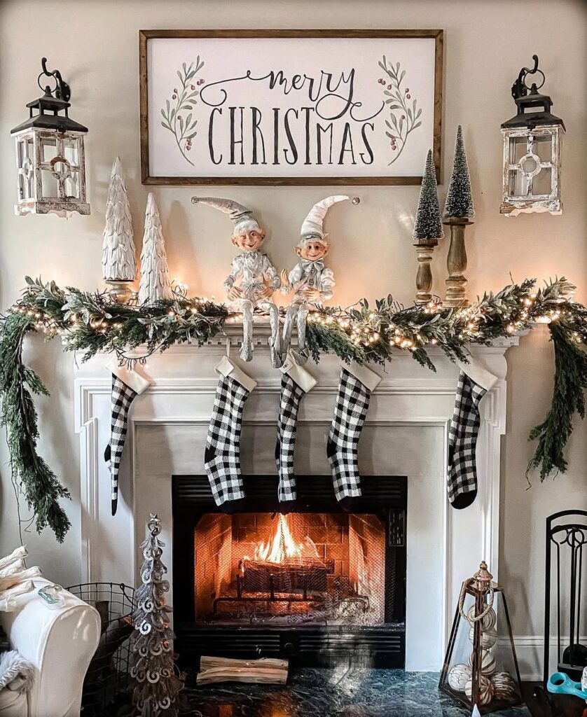 A playful approach featuring silver Christmas elves as the main attraction, positioned among lush greenery and warm string lights. Black and white buffalo check stockings hang below, while vintage-style lanterns provide ambient lighting. The mix of whimsical characters and classic holiday elements creates a charming, family-friendly atmosphere.