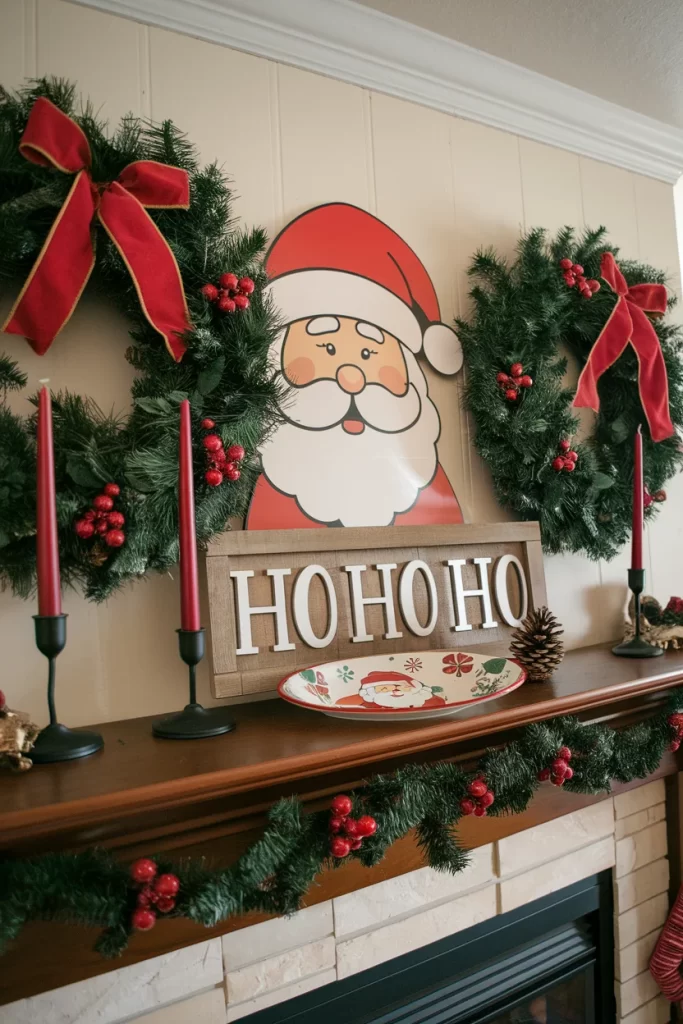 This playful display features a large cartoon Santa face cutout as the centerpiece, surrounded by evergreen wreaths with red bows. A “HO HO HO” wooden sign and festive plate add to the fun, child-friendly Christmas theme.