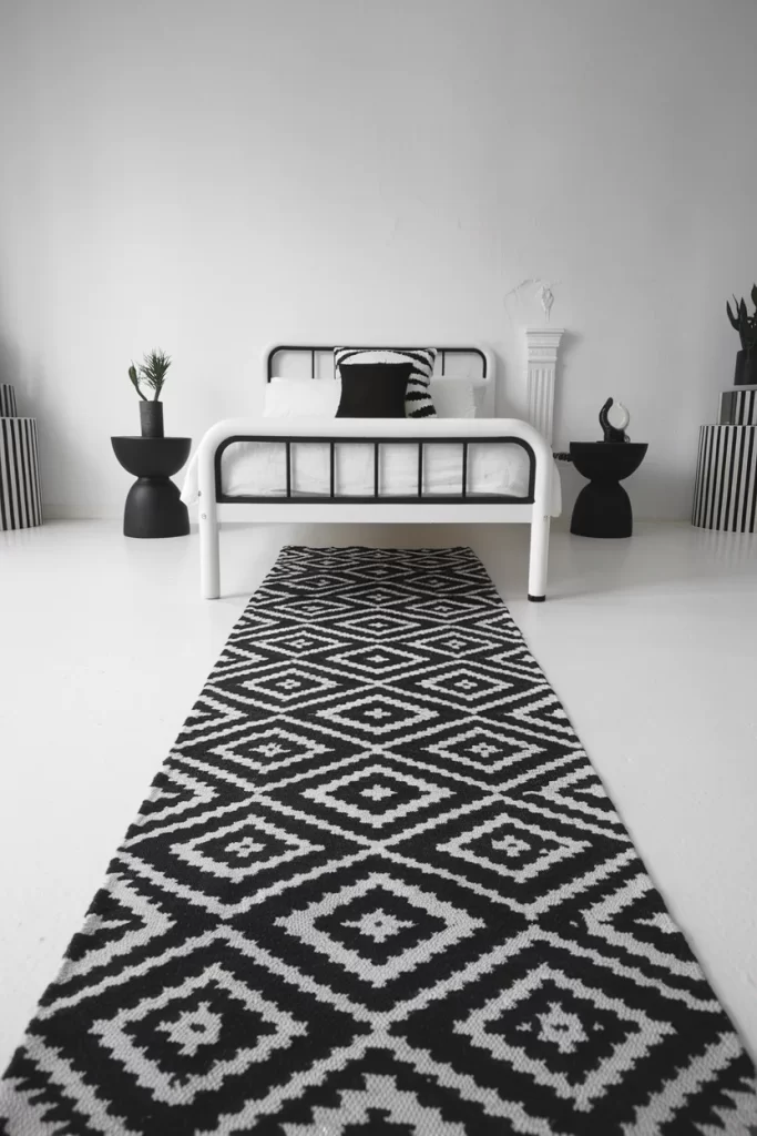 This bold bedroom demonstrates color drenching through pattern and contrast. The black geometric runner, matching bedside accessories, and striped elements create visual cohesion despite the high contrast palette. The monochromatic black and white scheme is carried throughout the space, from the metal bed frame to the patterned textiles, creating a striking modern aesthetic.