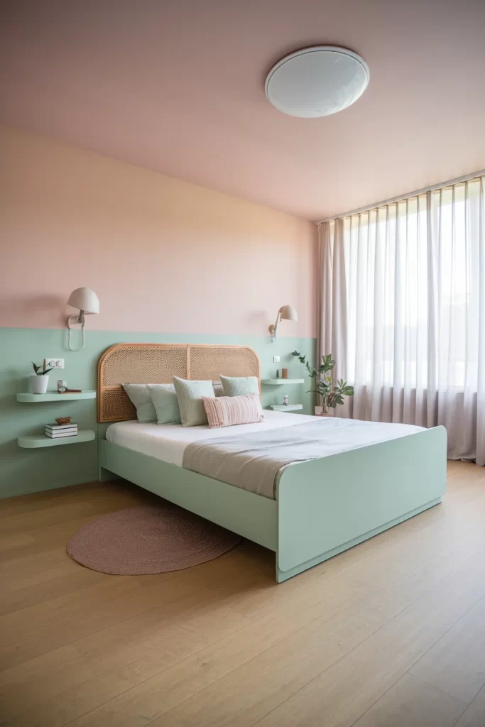 This playful bedroom combines two complementary colors in a color drenching approach. The walls feature a distinctive color-blocked design with soft blush pink on top and mint green below. The bed frame matches the mint green walls, while the natural cane headboard adds texture. The technique creates a fresh, modern look that’s both bold and soothing.