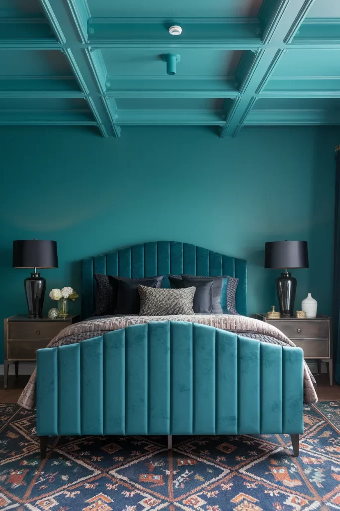 Making a dramatic impact, this bedroom uses rich teal throughout for a truly drenched effect. The velvet upholstered bed, matching walls, and coordinating coffered ceiling create incredible depth and richness. Dark wood furniture and brass accents add sophistication, while the patterned rug introduces complementary colors.