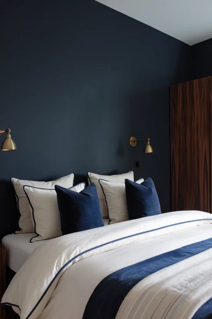 This refined bedroom uses navy blue as the dominant color-drenching element, creating a sophisticated and timeless atmosphere. The deep blue walls provide a rich backdrop for white linens with navy trim, while brass wall sconces add warm metallic accents. The approach demonstrates how darker colors can be balanced with lighter elements to prevent the space from feeling too enclosed. The consistent use of navy throughout different elements creates visual cohesion and elegance.
