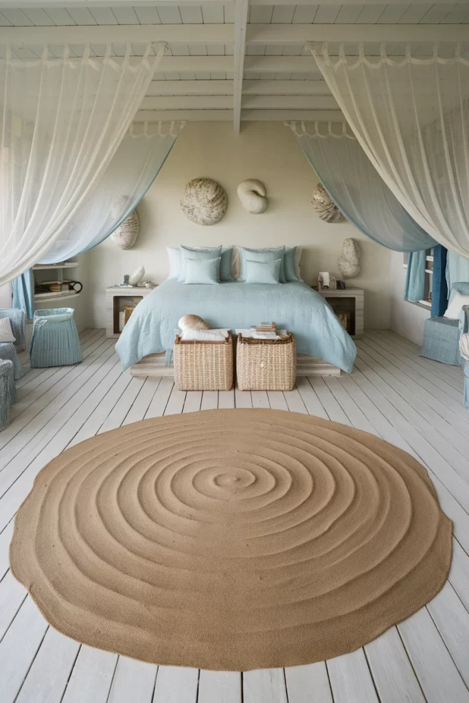 This coastal-inspired bedroom showcases color drenching through soft blue tones that extend from the bedding to the curtains and decorative elements. The white-painted ceiling beams provide architectural contrast against the monochromatic blue scheme, while natural textures like the jute rug and woven storage baskets add warmth. The canopy-style curtain treatment reinforces the color story while creating an intimate sleeping area. Shell and coral wall decorations enhance the seaside theme without breaking the cohesive color palette.