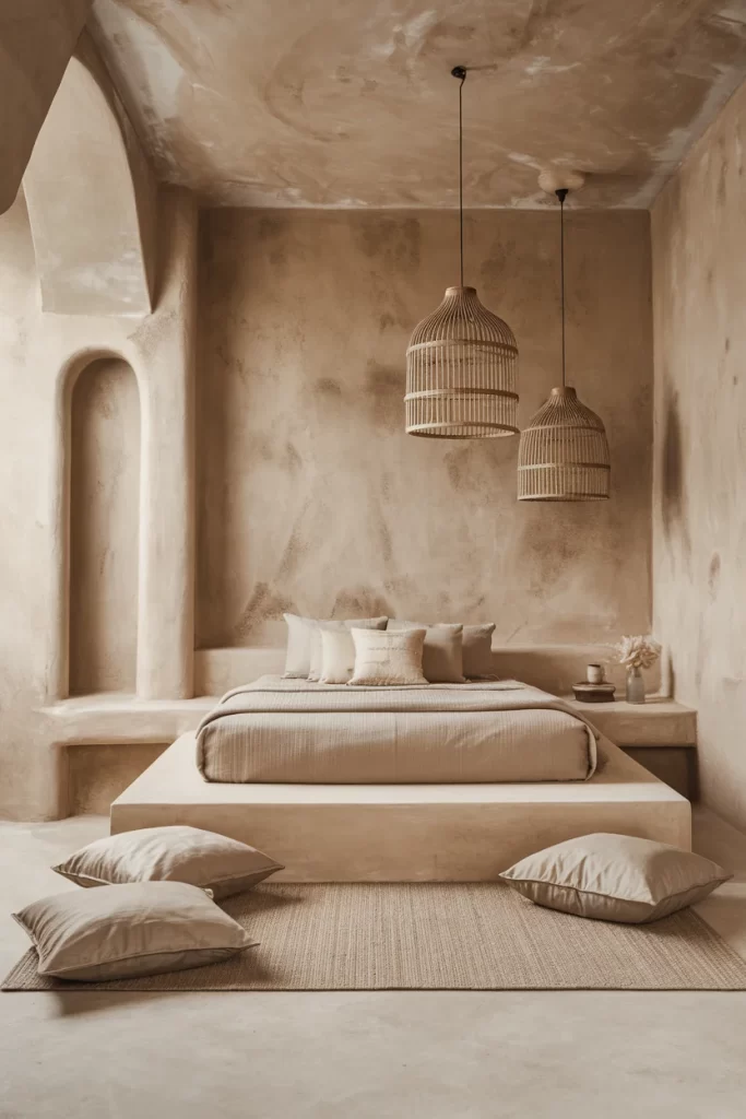 Inspired by desert landscapes, this bedroom showcases stunning earth-tone color drenching. The curved architectural details and built-in ledges create organic shapes that complement the warm beige and tan color palette. Natural textures like the woven pendant lights and jute rug enhance the earthy, minimalist aesthetic.
