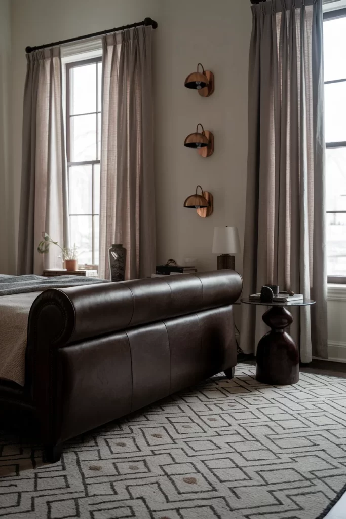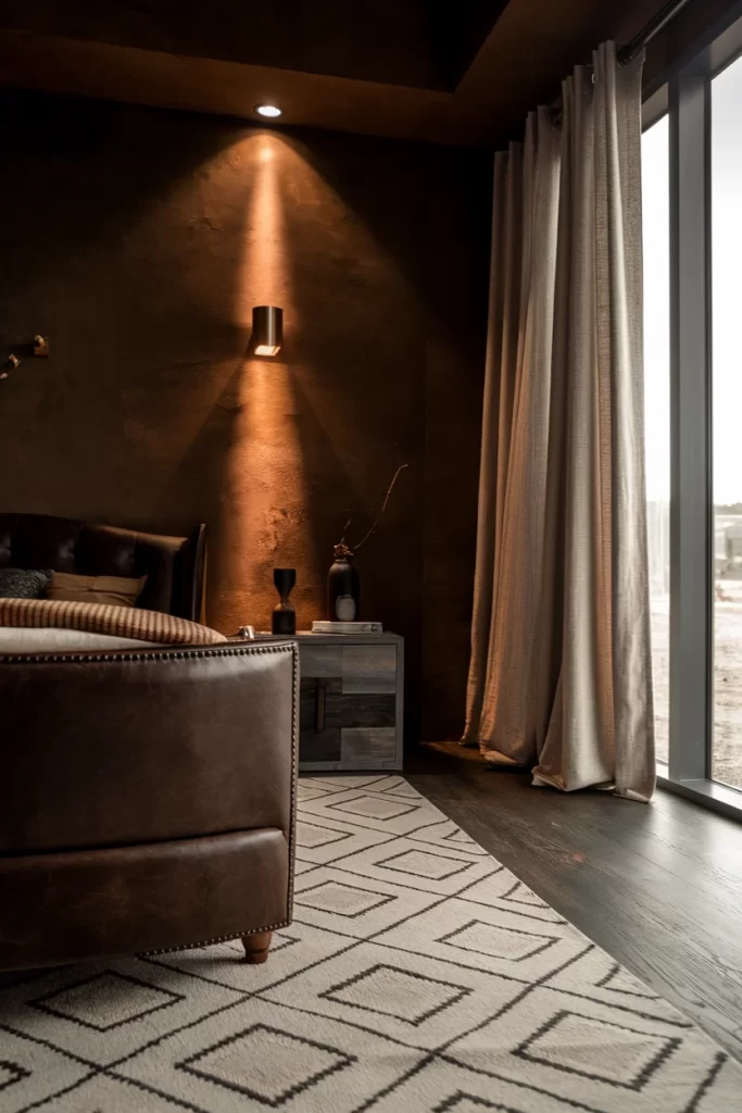 This bedroom uses warm taupe and brown tones throughout the space, from the wall color to the textiles and furniture finishes. The leather bench and geometric patterned rug provide textural interest while maintaining the earthy color palette. Copper wall sconces add metallic warmth that complements the overall scheme. This approach shows how neutral color drenching can create sophisticated, hotel-like atmospheres that feel both comfortable and refined.