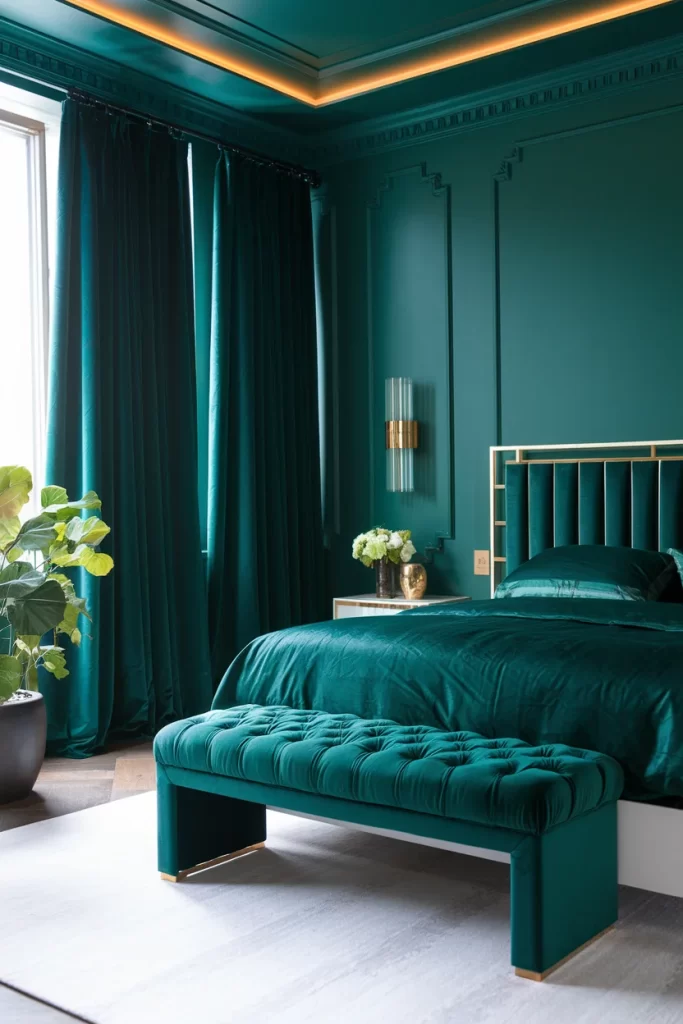 This luxurious bedroom showcases emerald green color drenching at its finest. The deep teal walls are complemented by matching curtains, bedding, and an elegant tufted bench at the foot of the bed. The monochromatic approach creates a cocoon-like atmosphere, while gold accents through the headboard frame, ceiling lighting, and decorative elements add warmth and sophistication. The inclusion of fresh greenery reinforces the natural color palette and brings life to the space.