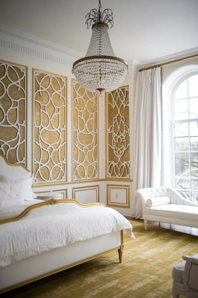 This opulent bedroom showcases how metallic tones can create stunning color drenching effects. The gold and cream color palette flows from the ornate wall panels to the bed frame and accent rug. The decorative molding and crystal chandelier add layers of luxury and texture while maintaining the cohesive golden theme.