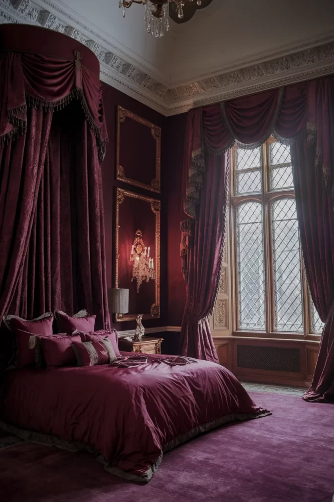 This opulent bedroom showcases deep purple color drenching in a traditional, formal setting. The rich plum walls, matching curtains, and coordinated bedding create an immersive color experience reminiscent of historical palatial interiors. Ornate crown molding, crystal chandeliers, and gold picture frames provide luxurious details that enhance the dramatic color choice. This example demonstrates how color drenching can be used to create spaces with historical character and theatrical impact.