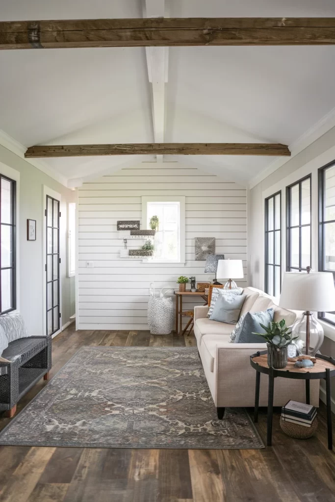This bright living space demonstrates color drenching in soft whites and creams. The shiplap accent wall, exposed ceiling beams, and furniture all work within the same neutral palette. The monochromatic approach creates a clean, airy feeling while vintage rugs and natural textures add warmth and character. This technique makes the room feel larger and more cohesive.