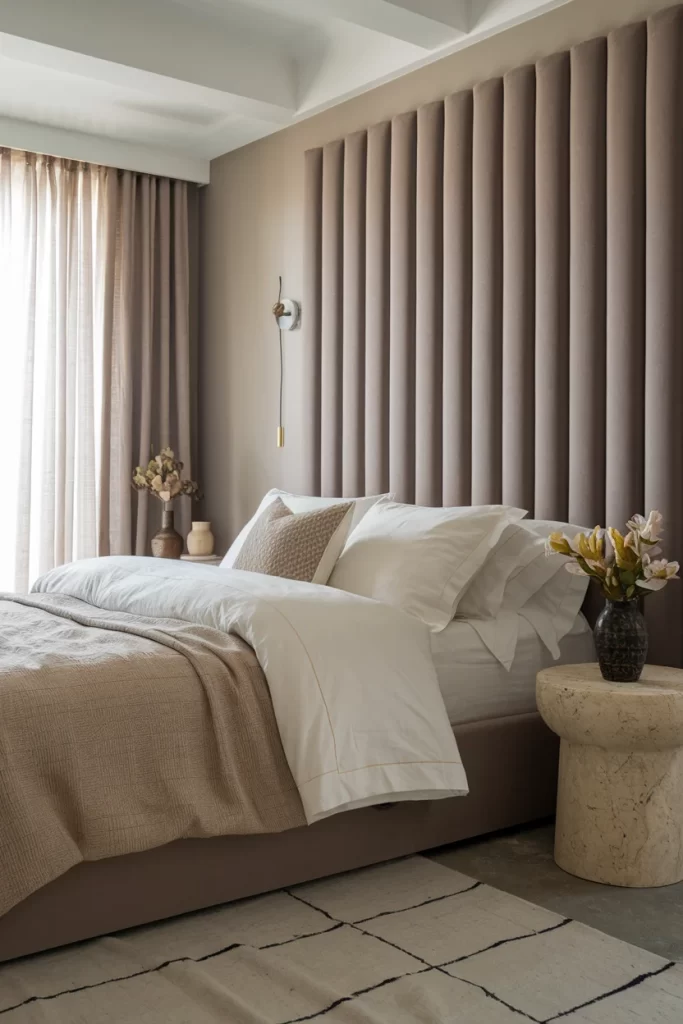 This serene bedroom showcases the power of monochromatic neutral drenching. The taupe and beige color palette flows seamlessly from the dramatic fluted accent wall behind the bed to the flowing curtains and bedding. The vertical fluted panels create stunning texture and visual interest while maintaining the cohesive color story. Natural materials like the woven throw and stone side table add organic warmth to the space.