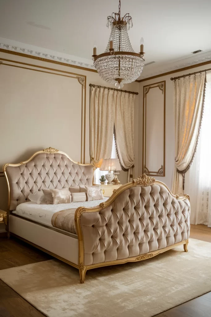 This luxurious bedroom employs color drenching in warm neutrals, with every surface from walls to furnishings sharing similar tonal qualities. The ornate tufted bed frame and crystal chandelier add glamour while maintaining the cohesive color story. Gold trim and hardware provide elegant metallic accents that enhance rather than break the neutral palette. The silk curtains and formal window treatments reinforce the sophisticated atmosphere while staying within the established color family.