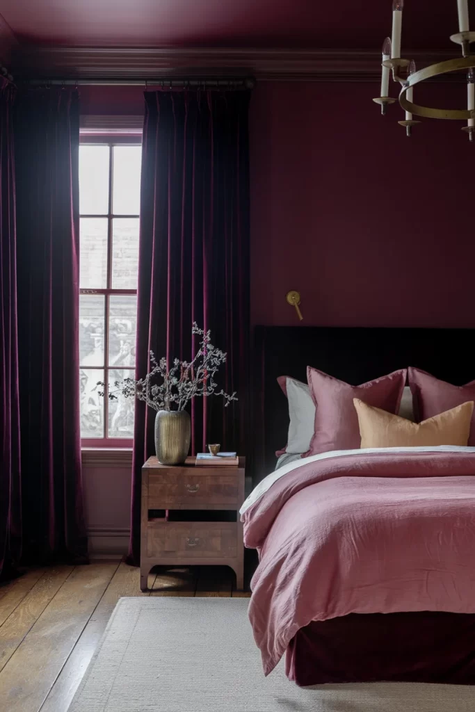 This dramatic bedroom embraces deep burgundy as the color-drenching element, extending from the walls through the ceiling to create an enveloping, intimate atmosphere. The matching bedding and window treatments reinforce the monochromatic approach, while the dark wood elements complement rather than compete with the rich color. This example demonstrates how darker colors can be successfully used in color drenching to create sophisticated, cocoon-like spaces that feel luxurious and dramatic.