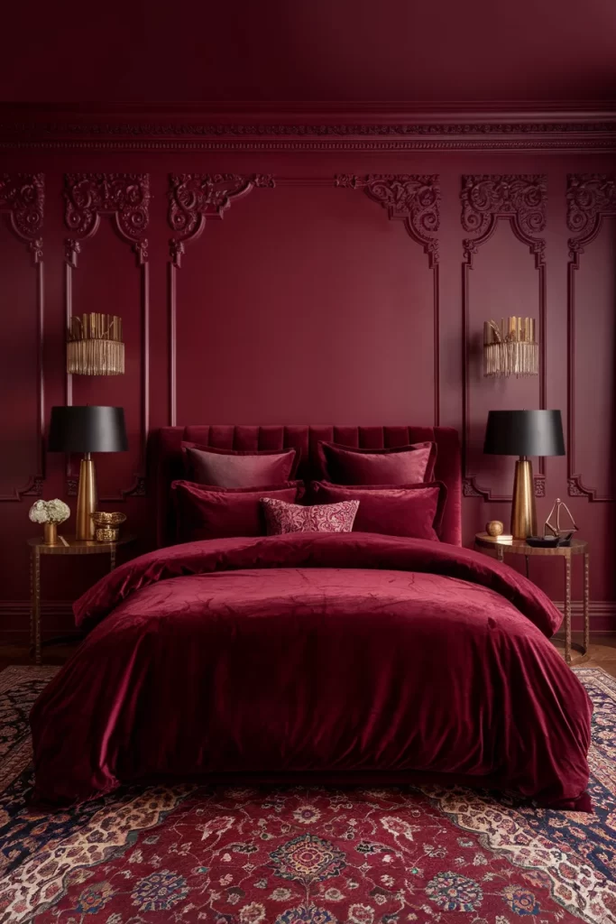 This opulent bedroom demonstrates how deep burgundy can create a regal, hotel-like ambiance. The color drenching technique extends from the ornate wall paneling to the sumptuous velvet bedding and decorative pillows. Classic architectural details like decorative moldings and columns are painted in the same rich tone, creating visual continuity. Brass table lamps and Persian-style rugs complement the burgundy beautifully, while the monochromatic scheme makes the space feel intimate and enveloping.