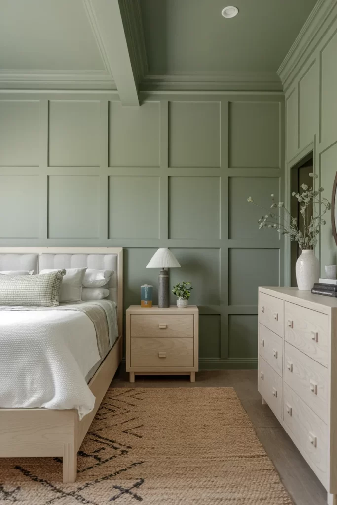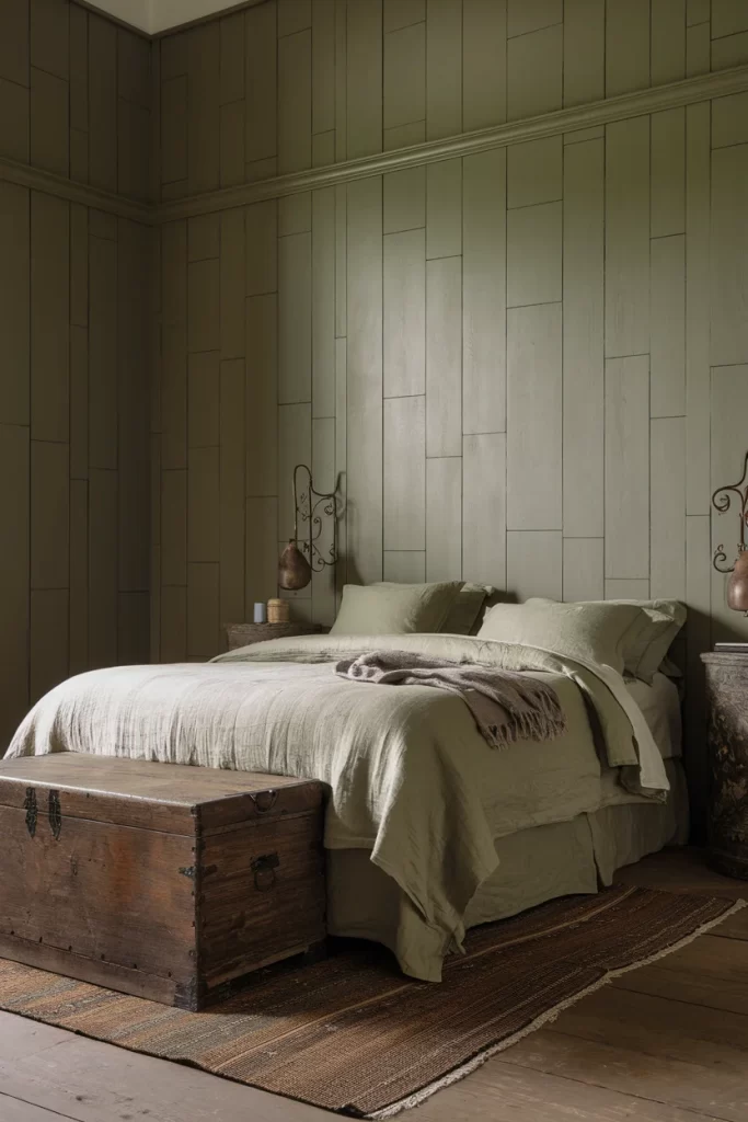 This bedroom demonstrates how sage green can transform a space when used as a color-drenching technique on wood paneling. The vertical wood planks are painted in varying shades of muted green, creating depth and visual interest without overwhelming the space. The rustic wooden chest at the foot of the bed and natural fiber rug complement the earthy palette, while neutral linens prevent the green from becoming too dominant. This approach works particularly well in bedrooms where you want to create a calming, nature-inspired retreat.