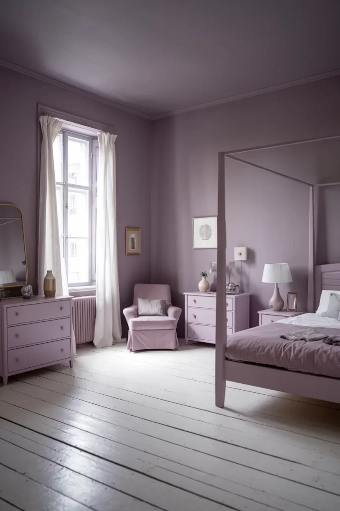 This serene bedroom showcases color drenching in a softer palette with dusty lavender tones. The painted walls, furniture, and even the four-poster bed frame are all rendered in complementary purple hues. White painted floorboards provide contrast and keep the space feeling fresh rather than overwhelming. The monochromatic approach creates a dreamy, calming atmosphere perfect for rest and relaxation.
