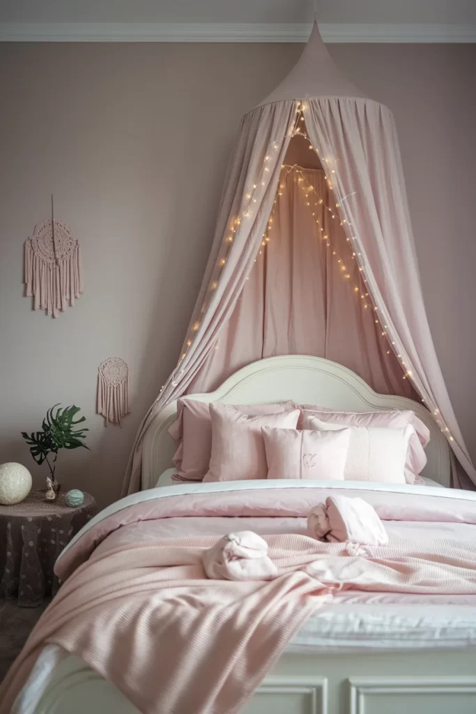 This dreamy bedroom demonstrates how to use soft pink throughout a space for maximum impact. The blush pink canopy creates a romantic focal point, while coordinating bedding in various shades of pink maintains the monochromatic scheme. The macrame wall hangings and fairy lights add whimsical texture and warmth to the gentle color palette.