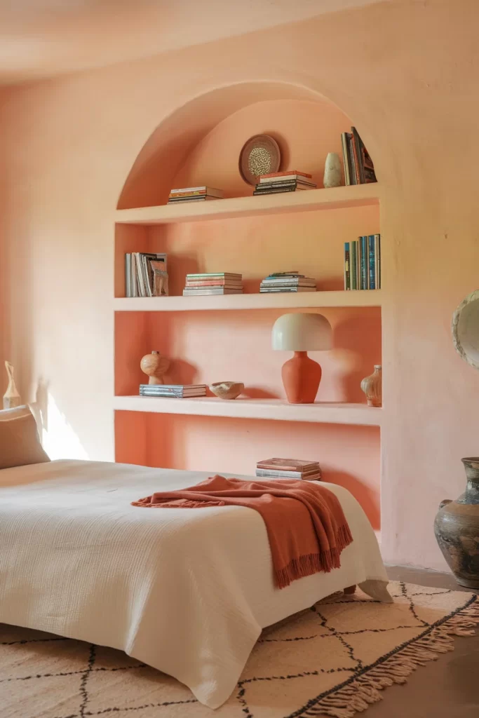 This cozy bedroom embraces the trending terracotta color family with confidence. The built-in arched bookshelf becomes a striking focal point painted in warm orange tones, while cream and neutral bedding provide balance. The curved architectural details and natural textures create a Mediterranean-inspired sanctuary.