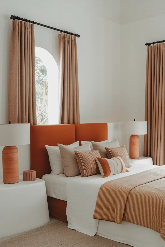 This warm bedroom showcases earthy terracotta orange used strategically throughout the space. The color appears in the upholstered headboard, decorative accessories, and soft furnishings, while cream walls provide balance. The arched window adds architectural interest, and the color drenching technique creates a Mediterranean-inspired atmosphere that feels both exotic and welcoming.
