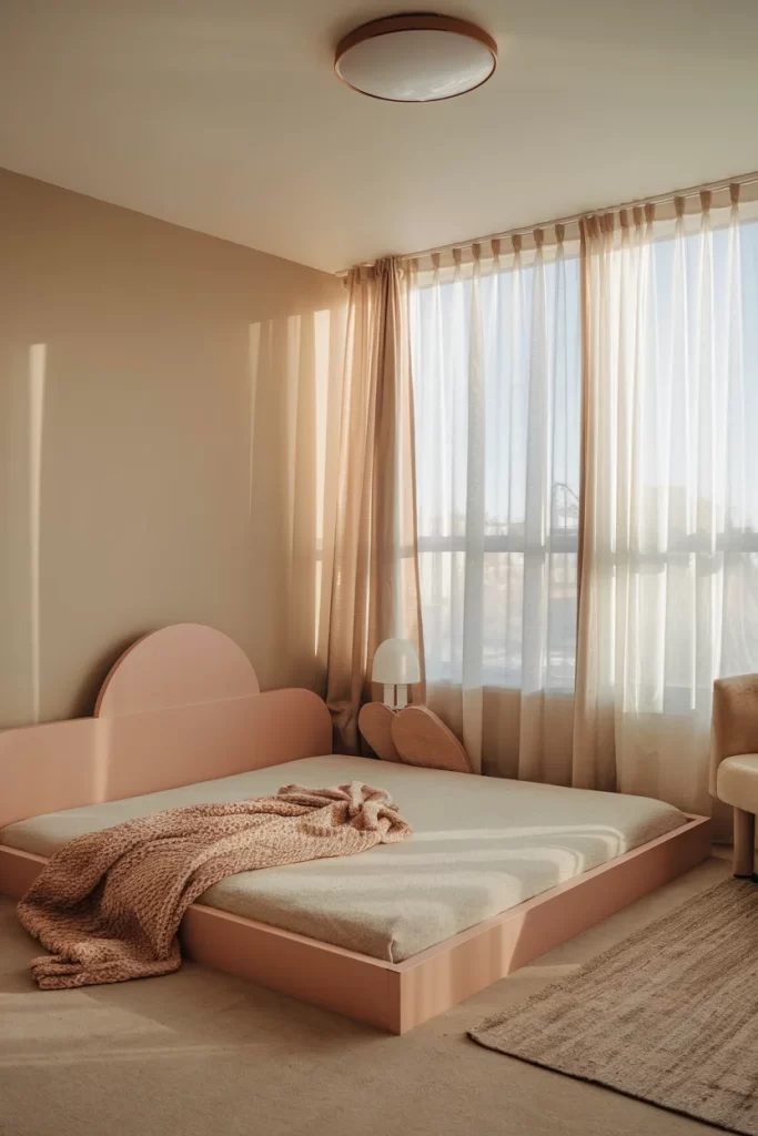 This contemporary bedroom uses blush pink as the primary color-drenching element, creating a cocoon-like effect. The low platform bed design is complemented by the rounded headboard, both in matching pink tones that flow seamlessly into the wall color. The geometric area rug provides subtle pattern without competing with the monochromatic scheme, while natural light filtering through sheer curtains enhances the warm, rosy atmosphere. This approach demonstrates how color drenching can work in modern, minimalist settings.