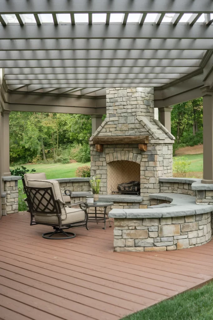 This design features a beautiful traditional outdoor fireplace built with stacked stone masonry, creating a rustic yet refined centerpiece. The slatted pergola overhead provides partial shade while allowing natural light to filter through, and the curved stone seating walls extend from the fireplace base, offering built-in seating options. Set on a wooden deck, this space perfectly balances formal stonework with the warmth of natural wood, making it ideal for both casual gatherings and elegant outdoor entertaining.