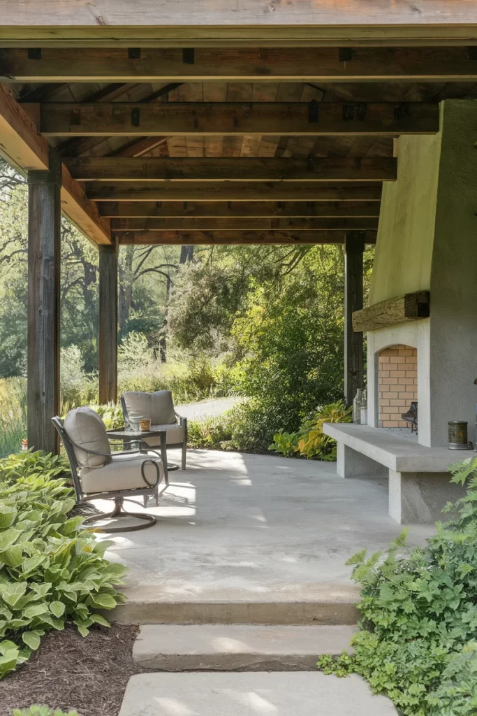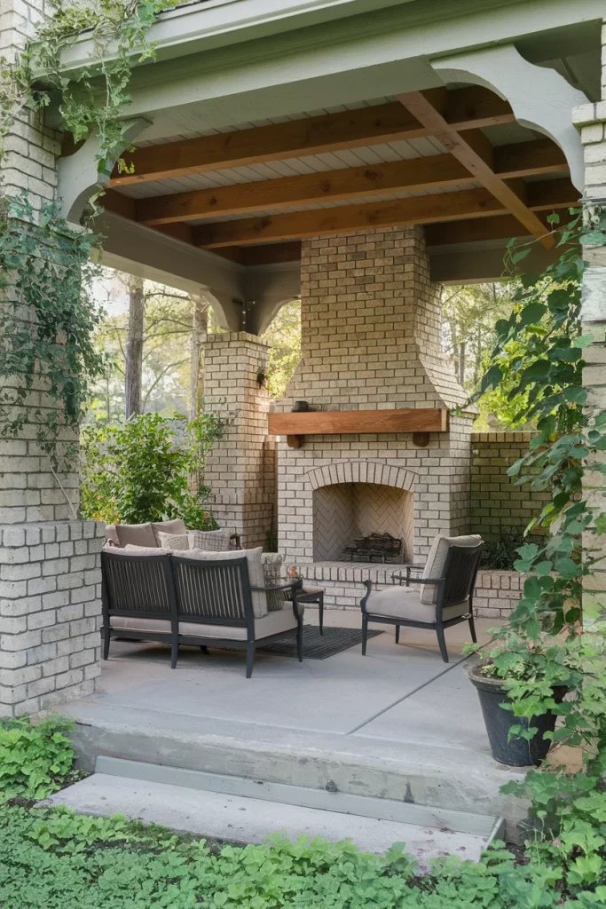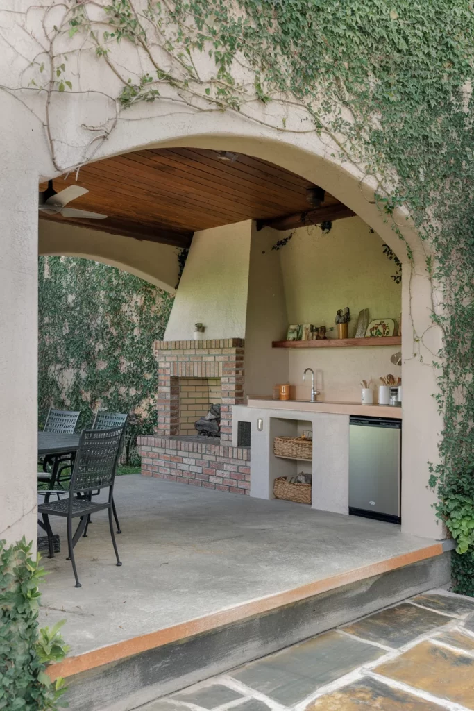 This intimate covered patio features a painted brick fireplace with a curved chimney that adds whimsical character. The arched ceiling beams create architectural interest, while climbing vines blur the boundaries between structure and garden. The space demonstrates how painted brick can lighten and brighten a fireplace design, making it suitable for smaller or more enclosed patios. Simple concrete steps and dark wood furniture provide understated style, allowing the unique fireplace design to take center stage.