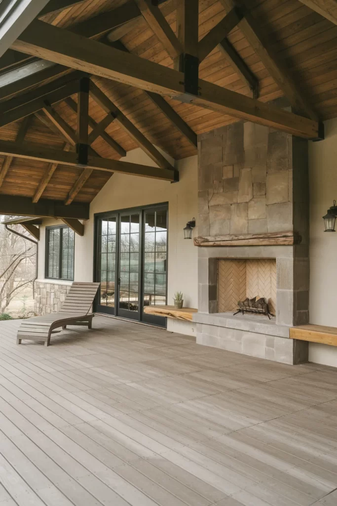 A sleek covered patio design featuring exposed timber trusses painted in rich wood tones against a lighter ceiling. The fireplace presents a modern interpretation with smooth stone cladding and a herringbone firebox insert. Light wood decking and a streamlined chaise lounge emphasize the contemporary aesthetic, while large black-framed glass doors connect the space to interior rooms. The extended hearth provides additional seating and surface area.