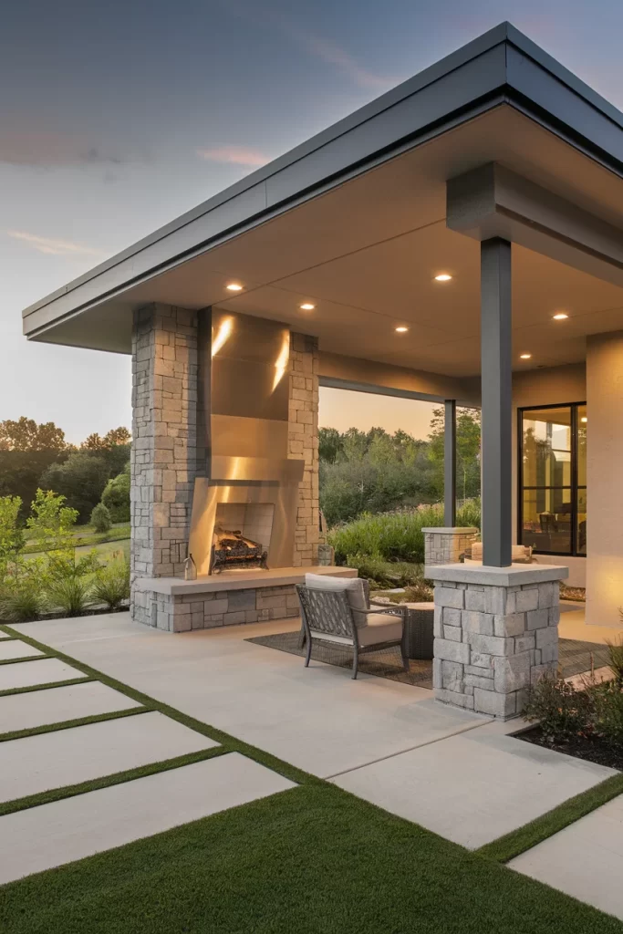 This minimalist pavilion features a dramatic flat roof with deep overhangs that appear to float above stone pillars. The clean-lined stucco fireplace with a tall chimney creates a strong vertical element against the horizontal emphasis of the roof. Large-format concrete pavers with grass joints provide a modern ground plane, and the open design on all sides maximizes views while still providing shelter. The stone pillars with varied textures add depth without feeling heavy, making this ideal for modern or mid-century inspired homes.