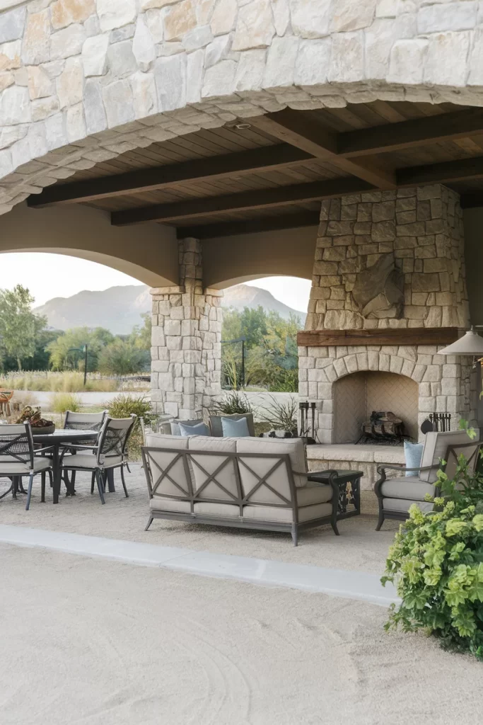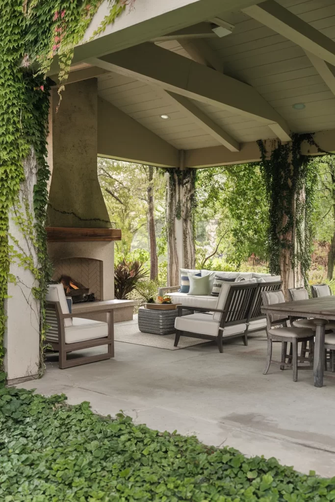 This sophisticated covered patio showcases a stunning outdoor living space where nature and architecture merge seamlessly. The exposed wooden beam ceiling creates an airy yet intimate atmosphere, while climbing vines cascade down the stone pillars, softening the structure’s edges. The focal point is a traditional stone fireplace with a herringbone firebox pattern, flanked by comfortable seating arrangements. The neutral color palette of grays and creams, combined with natural stone flooring, creates a timeless aesthetic perfect for year-round entertaining.