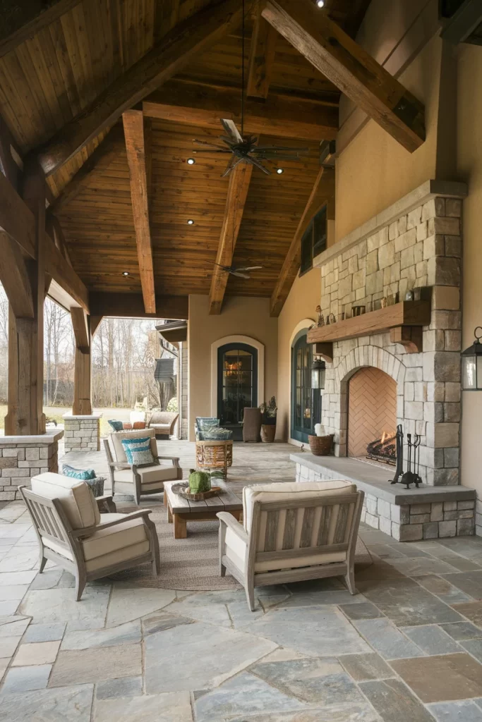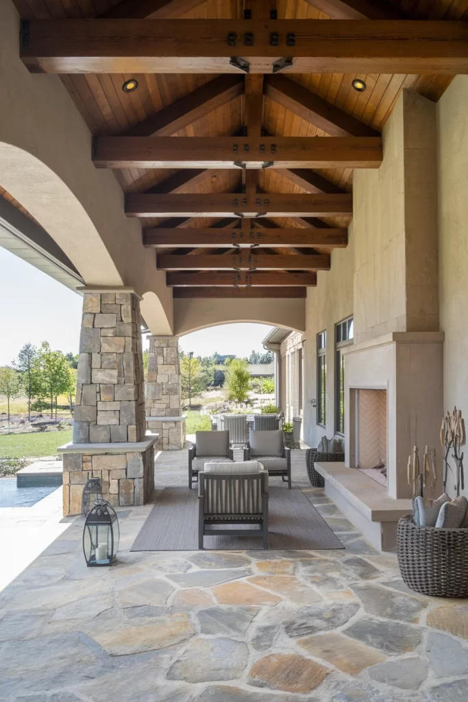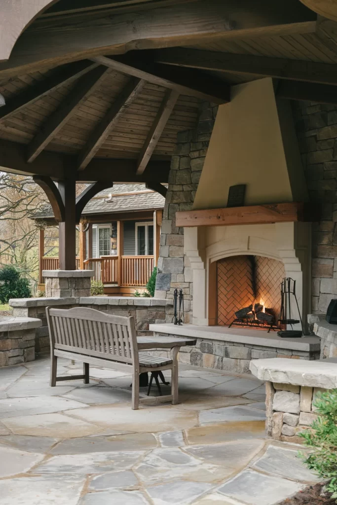 This elegant covered patio showcases a vaulted timber ceiling that creates dramatic height and visual interest. The fireplace features smooth cream-colored stone with an arched opening and substantial wooden mantel, offering a lighter, more refined alternative to darker stone options. Natural flagstone flooring in gray tones provides texture underfoot, while a simple wooden bench allows the architecture to shine. The design proves that covered patios can be both substantial and understated.