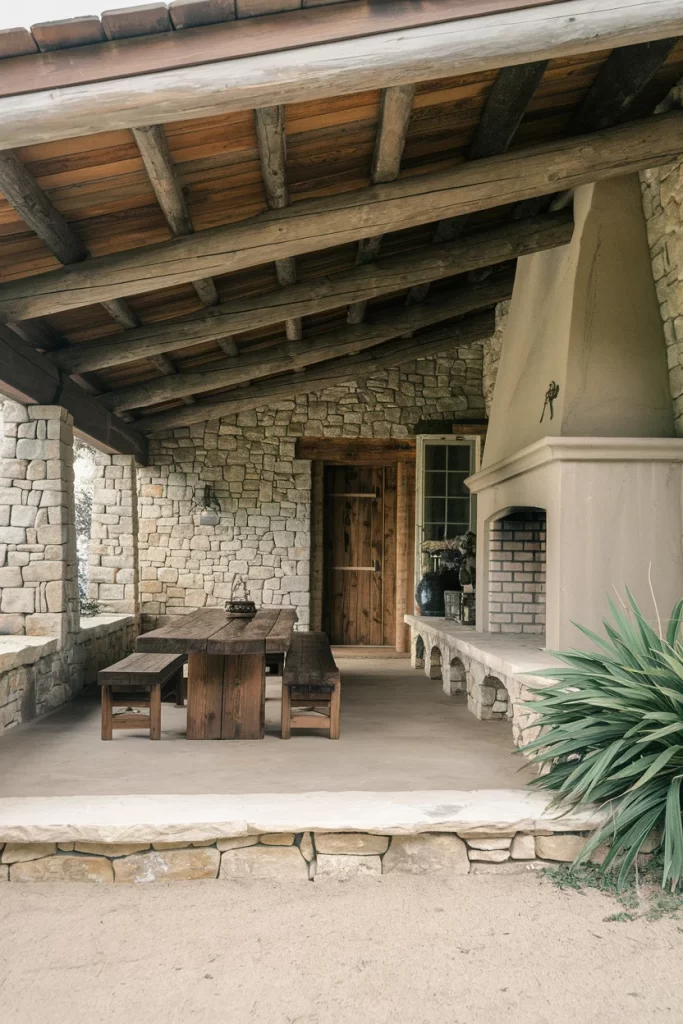 A covered patio with Old World charm showcases rustic timber ceiling beams over textured stone walls and smooth concrete flooring. The plastered fireplace hood creates a dramatic vertical element with Mediterranean flair, while a heavy wooden dining table and benches provide substantial, unfussy seating. The space successfully blends rough textures with smooth surfaces, and the open sides invite natural light while maintaining an intimate, sheltered atmosphere perfect for year-round outdoor dining.