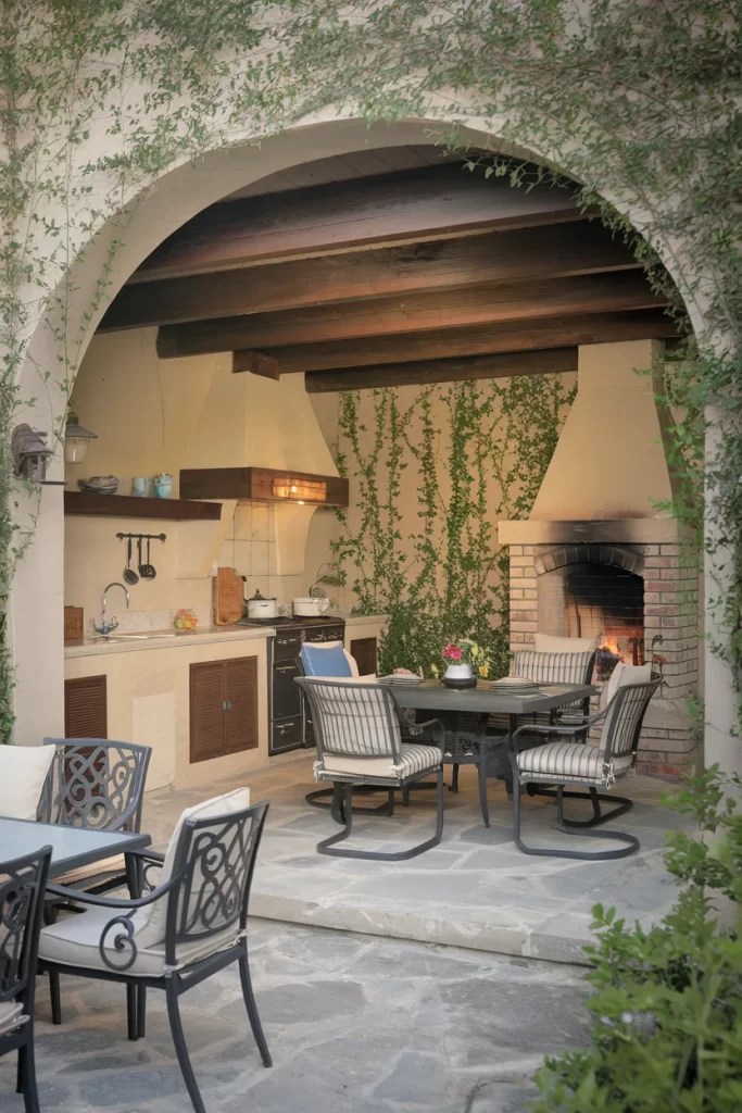 This arched alcove creates a charming Mediterranean atmosphere with vine-covered walls adding natural texture. The space combines a brick pizza oven with an outdoor kitchen featuring cream-colored cabinetry and open shelving. Dark metal dining furniture with striped cushions provides comfortable seating, while the rounded arch frames the entire cooking and dining area. The design emphasizes Old World charm and functionality.