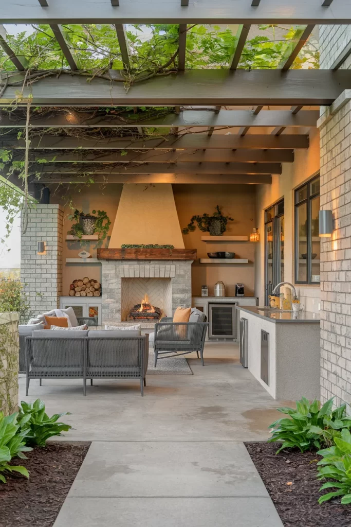 This covered patio features a contemporary pergola with exposed beams allowing filtered natural light. The focal point is a substantial stone fireplace with a reclaimed wood mantel, flanked by built-in seating and storage. An integrated outdoor kitchen with stainless steel appliances sits along one wall, while concrete flooring provides a durable, modern foundation. Climbing vines soften the structure’s edges.
