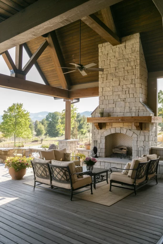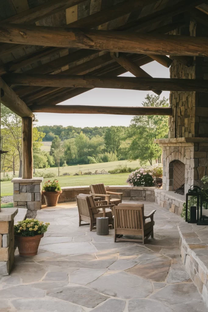 A sophisticated covered patio features hefty reclaimed timber beams creating an impressive structural framework above natural stone flooring. The stone fireplace with its arched opening anchors the space with traditional elegance, while built-in stone seating walls provide integrated functionality. Comfortable wooden outdoor furniture and potted flowers soften the robust architecture, and the open sides frame pastoral views, creating a perfect balance between shelter and connection to nature.