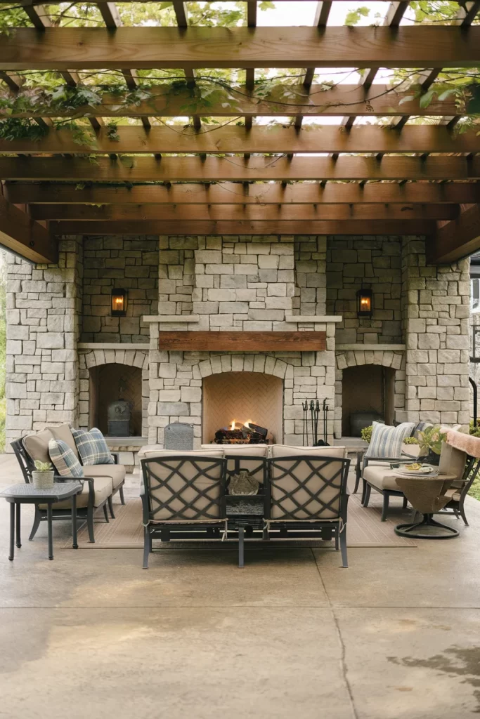 Classic Pergola with Stacked Stone Fireplace