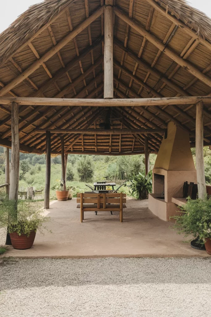 Rustic Thatched Roof Pavilion with Adobe Fireplace