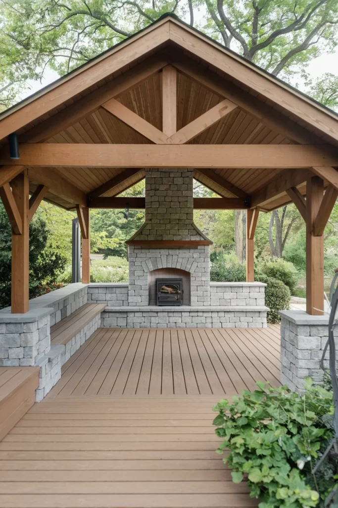 This stunning covered patio showcases a timber frame pavilion design with exposed wooden beams and a dramatic gabled roof. The centerpiece is a traditional stone fireplace with a classic arched opening, built from natural gray stone blocks that create texture and visual interest. The warm honey-toned wood ceiling with tongue-and-groove planking complements the natural stone beautifully. Composite decking provides a low-maintenance foundation, while stone knee walls on either side offer built-in seating and define the space. This design works perfectly for properties with mature trees, creating a woodland retreat atmosphere.