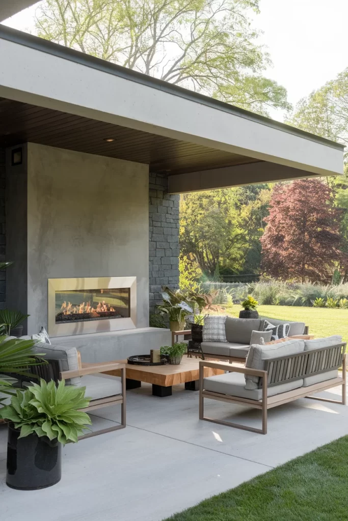 Sleek Contemporary Covered Patio with Linear Fireplace