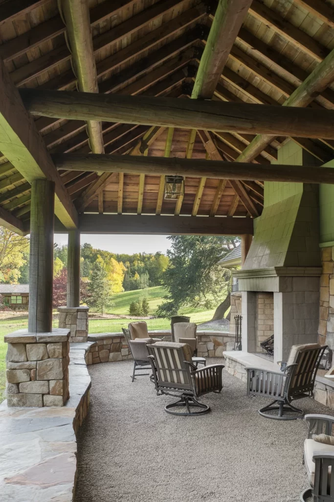 This substantial covered patio features an exposed timber frame roof structure with rich wood tones and a commanding stone fireplace as its centerpiece. The dimensional stone masonry creates impressive texture and visual weight, while comfortable swivel chairs on a pebbled surface offer flexible seating. The design emphasizes architectural craftsmanship with its visible joinery and structural elements, creating a space that feels both grand and inviting against a backdrop of rolling green lawns and mature trees.