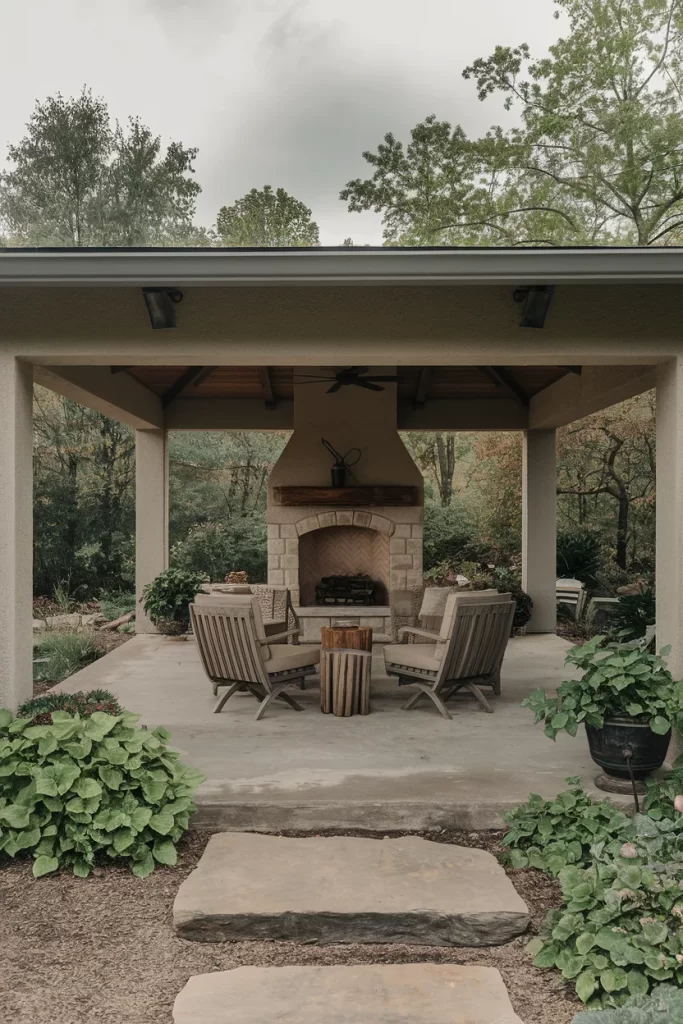 This classic design features a traditional masonry fireplace with a beautiful arched firebox opening, creating timeless appeal. The covered structure with simple columns and a standard roofline provides straightforward shelter that works with various architectural styles. Light-colored concrete or paver flooring keeps the space bright, while substantial plantings around the perimeter integrate the patio into the landscape. The generous scale of the fireplace ensures it remains the focal point, and the intimate furniture arrangement creates a cozy conversation area.
