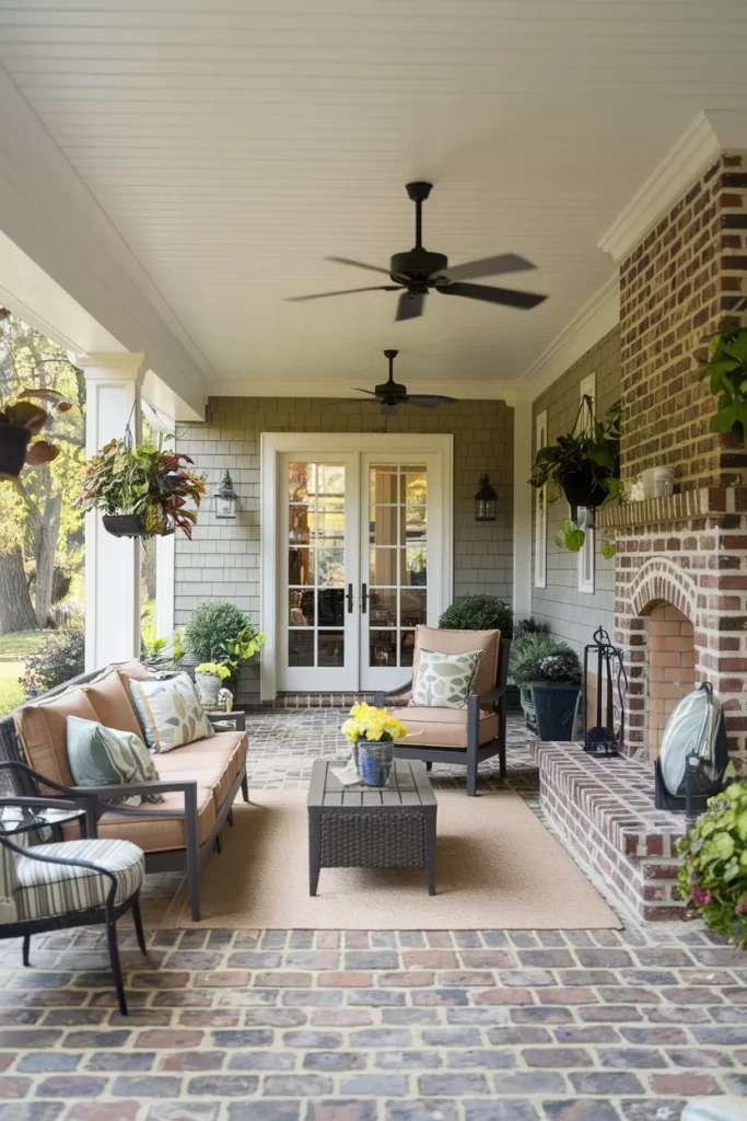 This classic covered porch incorporates a traditional brick fireplace into a more enclosed setting. The white ceiling with crown molding and ceiling fans adds residential comfort, while the brick pavers create pattern and visual interest underfoot. White columns and railings provide a clean, traditional framework, and the mixed materials of brick and painted wood siding create depth and character. Comfortable seating with coordinating cushions and decorative plants complete this cozy outdoor living room.