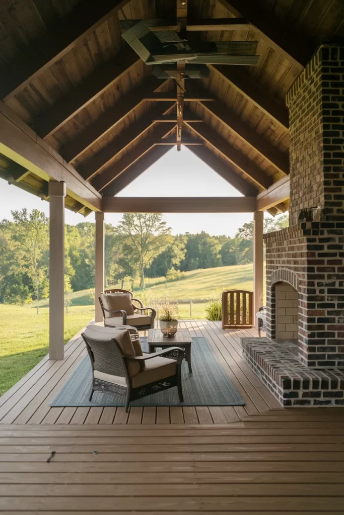 This charming covered patio features a cathedral ceiling with exposed rafters, creating an inviting, room-like atmosphere. The brick fireplace offers a classic, timeless look that complements various design styles. The wooden deck flooring adds warmth underfoot, while the open structure provides panoramic views of the surrounding lawn and trees. Simple, comfortable furnishings and a neutral rug define the seating area, making this space perfect for quiet relaxation or intimate conversations by the fire.