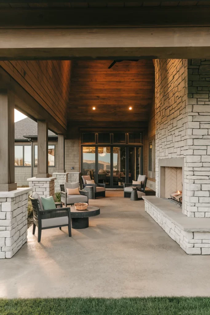 This versatile design bridges traditional and contemporary styles with its warm material palette. The wood-paneled ceiling with darker stained beams adds warmth overhead, while the combination of horizontal wood siding and stacked stone creates textural variety on the walls. The outdoor fireplace features a herringbone brick firebox that adds pattern and detail. Large glass doors maintain visual connection to interior spaces, and the concrete flooring provides a neutral, durable foundation that works with any furniture style.
