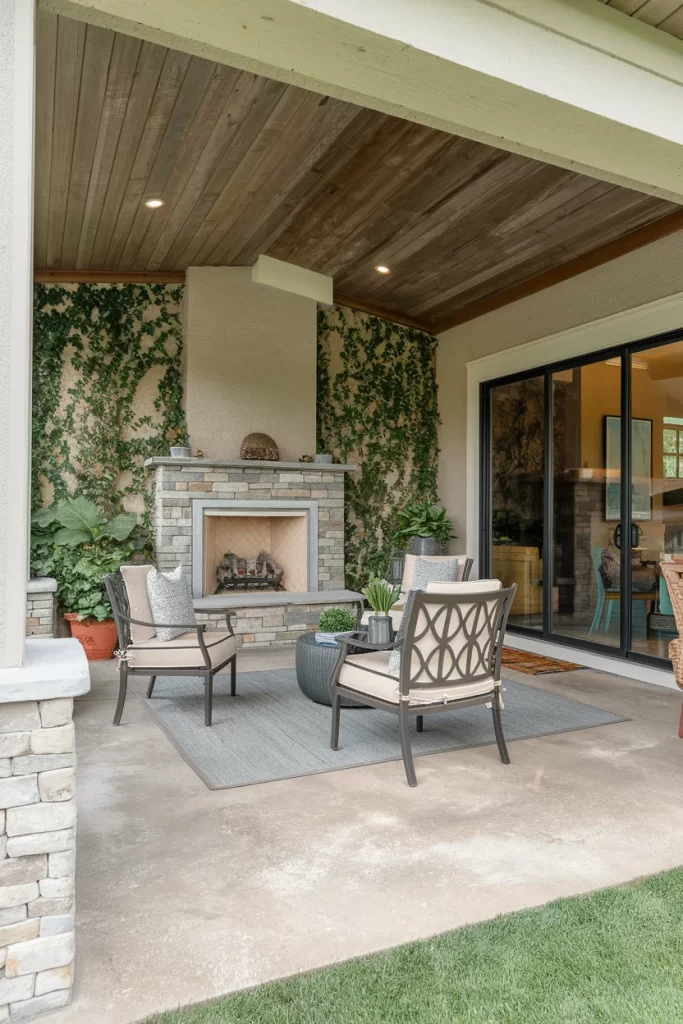 A covered patio featuring wood plank ceilings stained in warm tones creates an intimate atmosphere. The stone fireplace with herringbone detail is complemented by vine-covered accent walls that bring nature into the space. Modern metal furniture with neutral cushions balances the organic elements, while recessed lighting and ceiling fans provide practical functionality. The design successfully bridges traditional and contemporary styles.