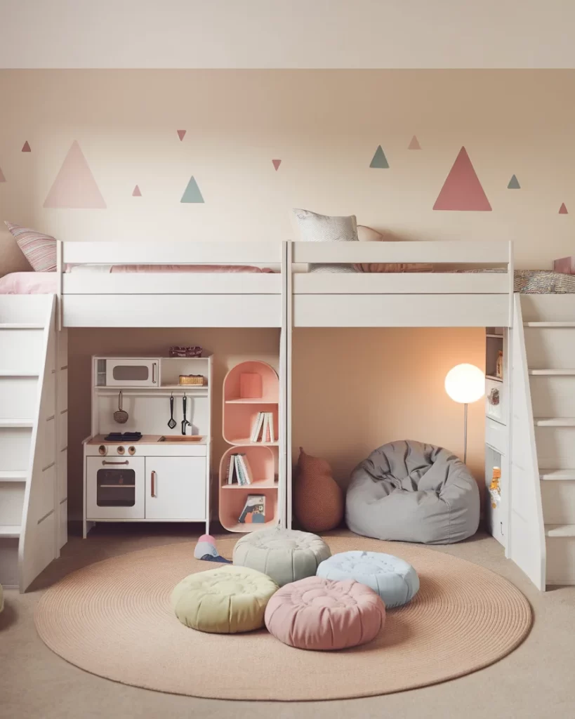 Maximize floor space while promoting fun and functionality with this loft-style shared bedroom. Elevated beds on each side create room for a cozy play zone below, featuring poufs, a beanbag, a standing lamp, and a mini kitchen set. The soft geometric wall decals and neutral-toned furnishings keep the design playful yet polished. If you’re working with a compact room, this layout helps you make the most of vertical space while keeping shared areas organized and engaging. Great for active little ones who love imaginative play.