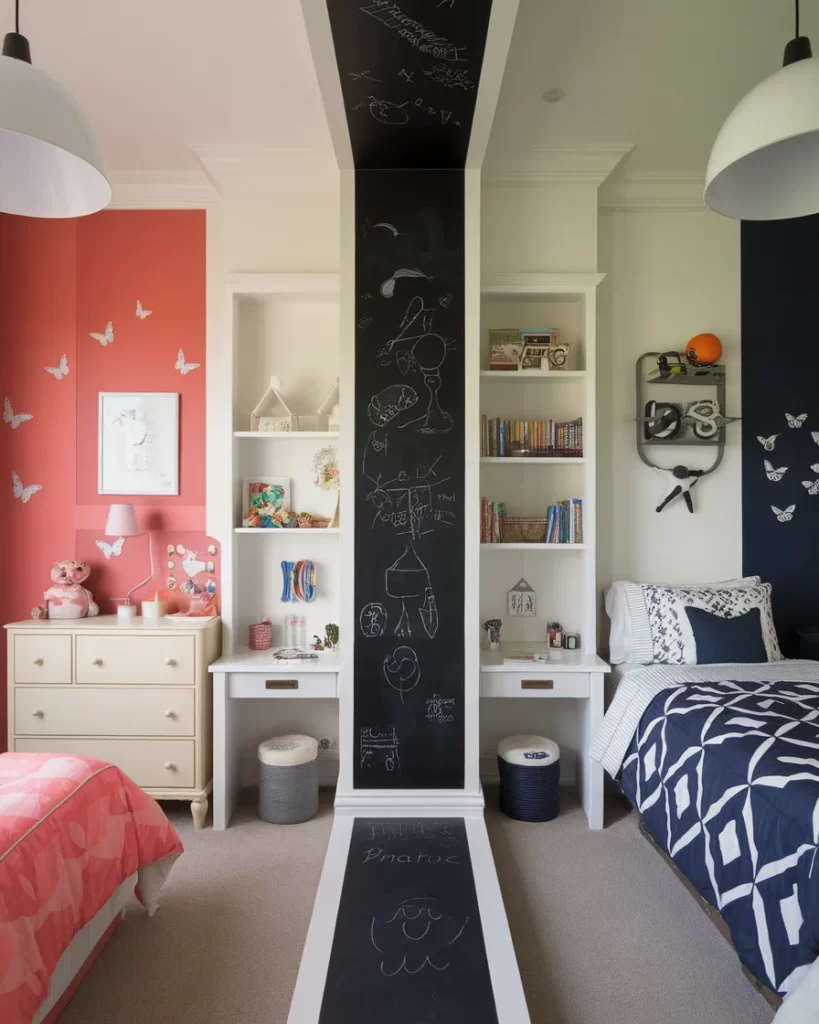 Inject creativity and structure into your child’s shared room with a tall chalkboard divider that doubles as a playful art canvas. This setup features a bright coral and navy color palette, butterfly wall decals, and matching study desks with shelving. The chalkboard not only adds visual height but also encourages imaginative play. It’s a practical solution for parents looking to separate zones without losing cohesiveness. The built-in shelves ensure that books and crafts stay neatly tucked away while fostering independence in each child’s space.