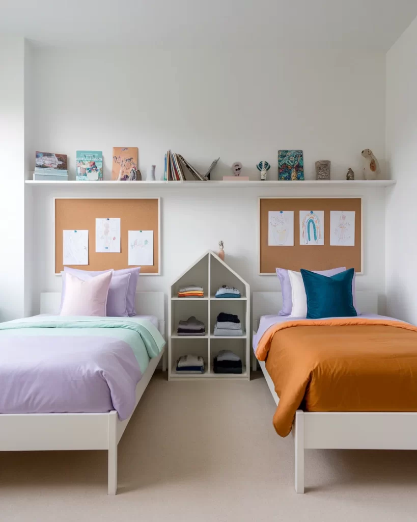 Simple yet striking, this divided kids room uses bedding colors and decor accessories to define individual zones. One bed is dressed in mint and lilac, the other in burnt orange and lavender, making each side pop. Corkboards above the beds allow for rotating art displays, while an open house-shaped cubby between the beds adds both charm and storage. The white backdrop and shelf full of books and crafts keep the design clean and inviting. It’s a fuss-free solution for parents looking to create individuality in a modern shared space.